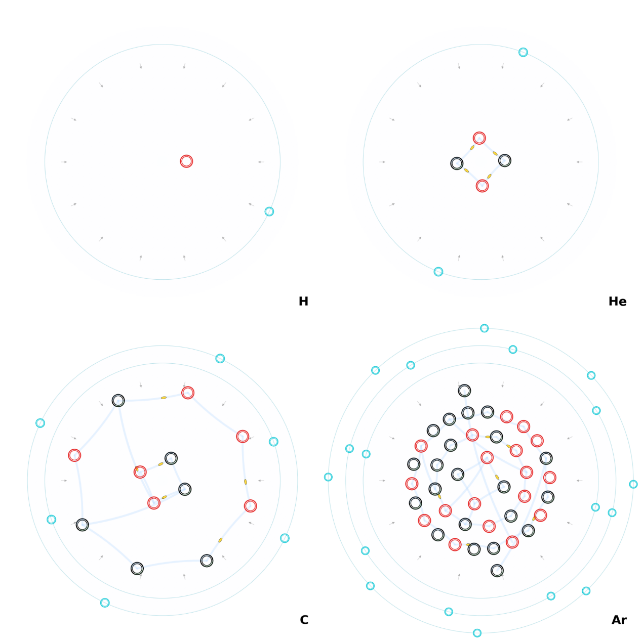 - Isotop: gunakan H-1, He-4, C-12, Ar-40; kulit digambarkan mengikut pengelompokan [2, 8, 18, 32] (cth Ar = [2, 8, 8]).